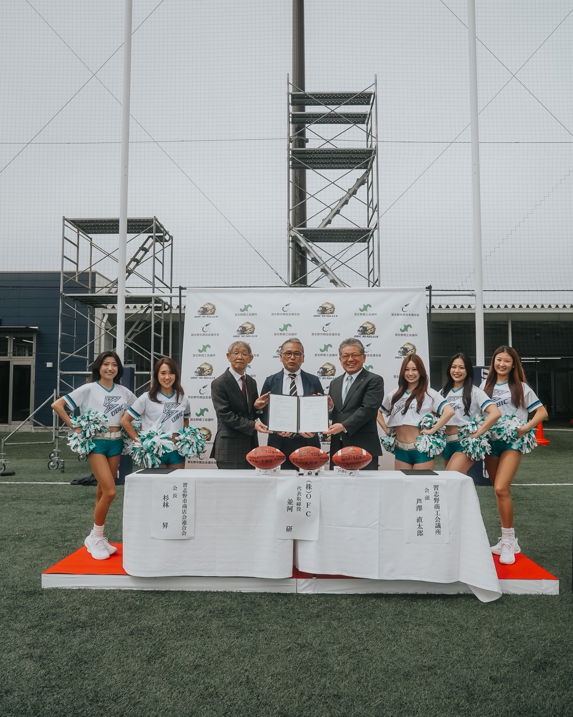 包括連携協定の締結について TOPICS 2026.04.08 4/5(日)、オービック習志野グラウンドで、習志野商工会議所、習志野市商店会連合会、オービックシーガルズの三者による包括連携協定の調印式を行いました。 本協定は、三者がそれぞれの強みを活かしながら連携・協力し、アメリカンフットボールを通じて地域の一体感の醸成と活性化、さらには地域経済の発展に寄与することを目的としています。